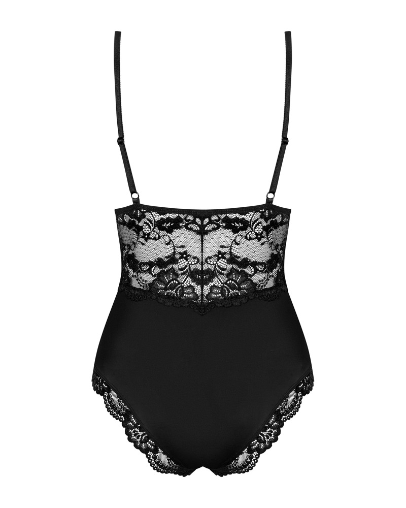 Magnifique body noir 810-TED-1 de Obsessive en matière stretch douce combinée à une fine dentelle élastique. Très confortable à porter ! Bonnets en dentelle rembourrés et opaques. Les bretelles sont réglables. Fermeture à crochets à l'entrejambe.