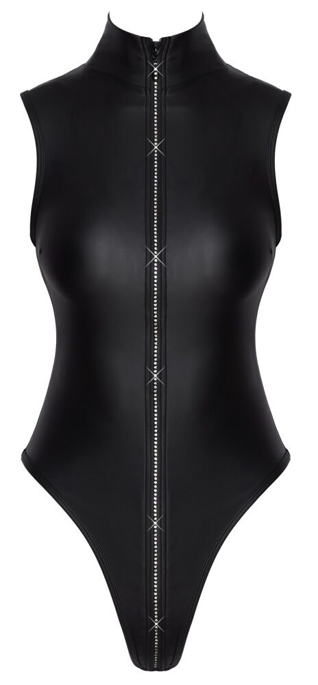 Body de Cottelli PARTY en un moderno look negro mate. Con una larga cremallera de strass brillante desde el cuello alto hasta la entrepierna. De estilo carioca, con aberturas extra altas en las piernas que permiten lucir las nalgas y las piernas en todo su esplendor. El material elástico de aspecto mate es suave al tacto para ofrecer la máxima comodidad y facilidad de movimiento.