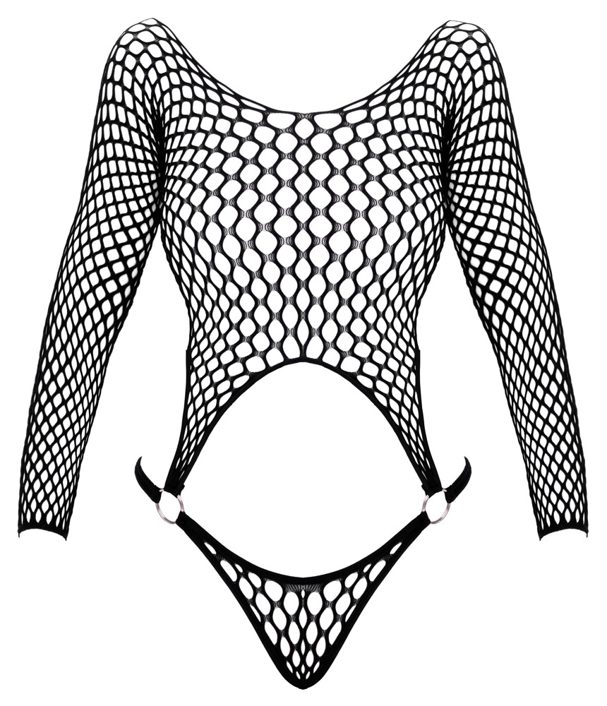 Zwarte visnet body van Fantasy by Cottelli met modieus grote mazen. In een geraffineerde tweedelige look, waarbij het topje met lange mouwen en de string aan de voorkant stevig met elkaar verbonden zijn met 2 decoratieve, zilverkleurige ringen. De hoge beenuitsnijdingen laten de billen en benen perfect uitkomen. Zeer elastisch en zacht rondom voor optimaal comfort.