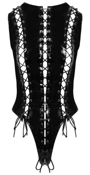 Extravagant body from Black Level completely in black vinyl. Tight-fitting and tailored to the neck with high leg cut-outs. The front has 3 open laces that can be individually adjusted to fit. The central lacing goes through the crotch to above the bottom. Zip fastening at the back and press stud fastening at the back of the neck.