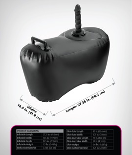 The inflatable sex cushion Body Dock Inflatable Love Seat from Fetish Fantasy Series has a patented Body Dock toy mount for the included Dillio Platinum Dildo that has a suction cup. Any other toy with a suction cup (e.g. vibrator/ masturbator) can also be easily and securely stuck to the docking plate. Perfect for wild rides because the sturdy handle can be held onto comfortably during the hot fun. The wonderfully sized inflatable cushion provides comfortable support during pleasurable bouncing.