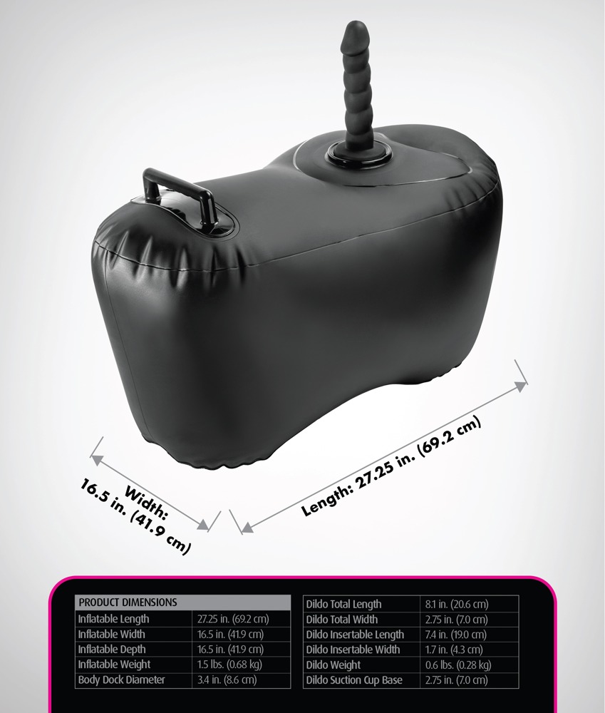 Nadmuchiwana poduszka miłosna Body Dock Inflatable Love Seat z serii Fetish Fantasy z opatentowanym uchwytem na zabawki Body Dock do dołączonego dildo Dillio Platinum z podstawą ssącą. Każda inna zabawka z podstawą ssącą (np. wibrator, masturbator) może być również łatwo i pewnie umieszczona na płycie dokującej. Idealny do dzikiej zabawy podczas jazdy, gdzie można wygodnie trzymać się solidnego uchwytu. Idealnie dopasowana poduszka powietrzna zapewnia wygodne podparcie i ekscytujące odbicie.