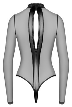 Ekskluzywne czarne body bez krocza z długim rękawem od Noir w ekscytującej przezroczystości. Ze sprytnie umieszczonymi, nieprzezroczystymi wstawkami w stylu power-wet: pasek na środku z przodu i w poprzek piersi (jak krzyż) oraz pasek na środku z tyłu. Całość w dopasowanym stylu z małą stójką. Elastyczna i miękka dookoła dla maksymalnego komfortu. Rozcięcie z tyłu, stójka zapinana na guziki. Uwodzicielsko otwarte w kroku.