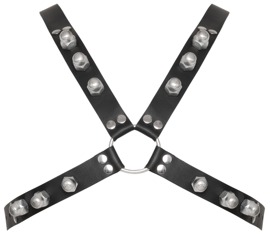 This black chest harness from ZADO is made out of high-quality and carefully crafted leather that stands out because of its striking decorative dome-shaped studs, silver-coloured metal buckles and solid rings. The robust X-shaped harness also stands out because of its exclusive look and long-lasting durability. The leather straps can be adjusted with the practical buckle fasteners for a perfect fit and maximum comfort. The harness can be worn on its own or as a stylish accessory over a T-shirt. This hot harness will definitely grab peoples' attention!