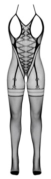 The black open cup catsuit from Fantasy by Cottelli is crotchless and made out of delicate net. Furthermore, there is a woven-in suspender body and suspender straps pattern on it. There are cut-outs over the breasts and a stretchy halterneck. The catsuit is backless. It is seductively crotchless too. With a foot part and reinforced toe part. It is soft, seamless and stretchy for a very comfortable fit.