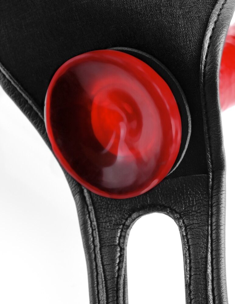 Ouvert streng i læder look med forstærket frontåbning, hvori en dildo/vibrator med sugefod (ikke vedlagt) kan indsættes. For ubegrænset pegging sjov og opfyldelsen af lesbiske drømme. Åben for gensidig forkælelse. Justerbar linning med velcrolukning.