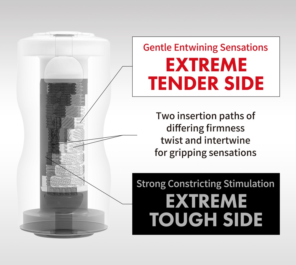 Masturbatorn Dual Sensation Cup Extremes från TENGA med spännande strukturerade lustkanaler som vrider sig i varandra. Det leder till en unik och intensiv känsla. Extreme Tender Side (vit) stimuelerar ömt och mjukt, Extreme Touch Side (svart) stimulerar starkt och kramande.