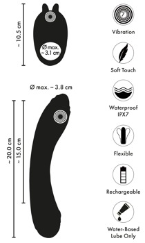 Both of the silicone toys are in wonderful shapes so that they not only adapt to each other, but also the body and its movements as well. The wonderfully curved vibrator, with its gentle grooves, hits the G-spot perfectly. The ring easily reaches the clitoris, thanks to its bulging bunny stimulator – whether it is being used on the vibrator or a penis. The velvety soft touch surface means that the vibrator can be easily inserted and the cock ring can be easily slid on – for hot stimulation and breathtaking fun.