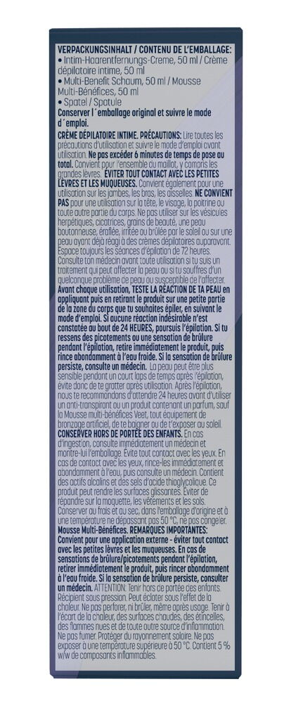 Intim-Haarentfernungscreme: Aqua, Cetearyl Alcohol, Potassium Thioglycolate, CalciumHydroxide, Urea, ParaffinumLiquidum, Ceteareth-20, Ceresin, Steareth-21, Glycerin, Parfum, Steareth-2, PotassiumHydroxide, Kaolin, Cetyl Hydroxyethylcellulose, Sodium Gluconate, ButyrospermumParkii Butter, Geraniol, Citronellol, Limonene / Multi-Benefit Schaum: Aqua, Panthenol, ParaffinumLiquidum, Butane, Steareth-2, Ceteareth-12, Isobutane, Stearyl Alcohol, Propane, Ceteareth-20, Phenoxyethanol, Dimethicone, Allantoin, Glycerin, Distearyl Ether, Ethylhexylglycerin, Citric Acid