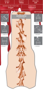 The easy-to-hold masturbator, Fantasy Lilith Fukumoto Shokushu from Fleshlight, is in a discreet, black case that is in a torch design. The case also has a protective lid too. The opening is a realistic replica of the naughty and seductive anime girl's vagina. There are intense and stimulating tentacle textures inside the masturbator as well. The masturbator has different diameters, which means that an orgasmic massage can be enjoyed during a handjob.