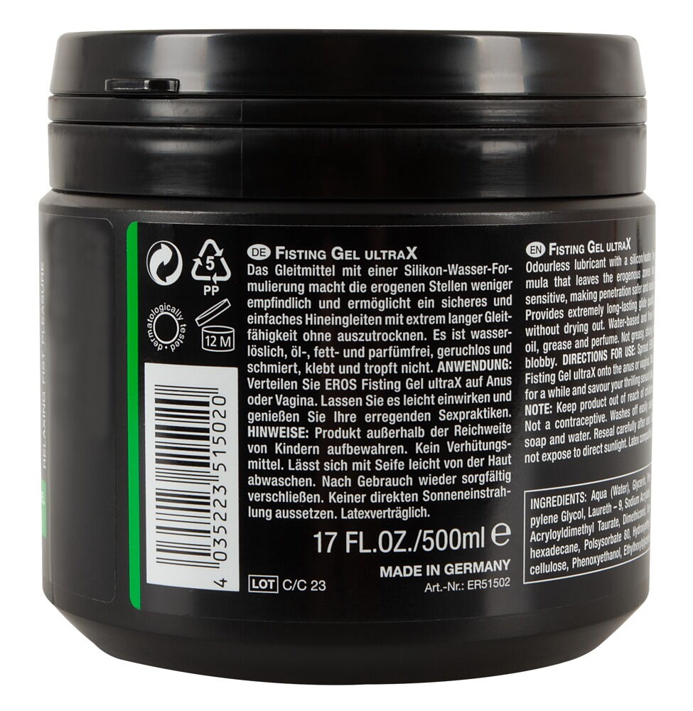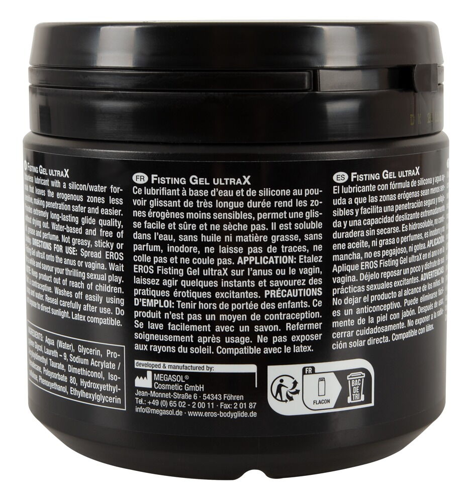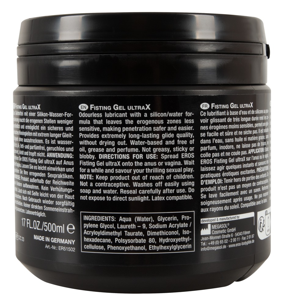 The silicone-water-based lubricant, Fisting Ultra X from EROS, has extremely long-lasting lubrication and doesn't dry out. Water-soluble, free from oil, grease and perfume, odourless. It does not smear, stick or drip. Apply to the desired areas of the body, allow it to soak in slightly and then enjoy exciting sex. Compatible with latex.