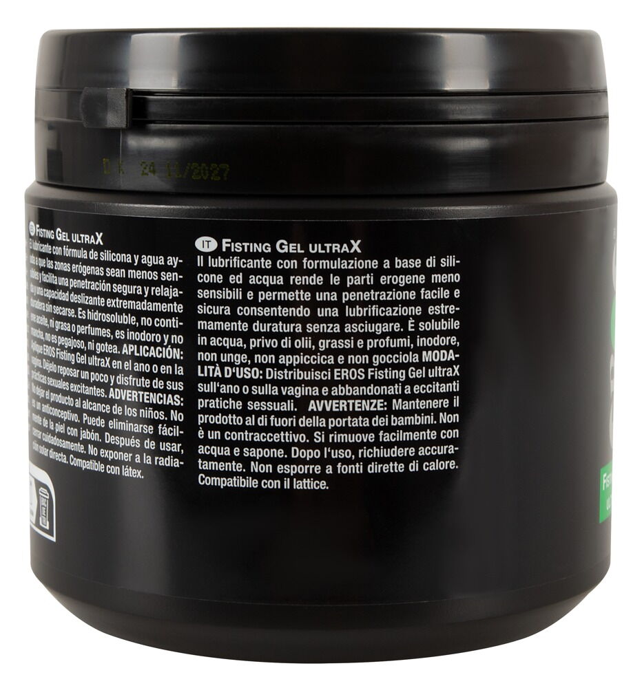 Lubricante para fisting UltraX de EROS con formulación de silicona-agua y lubricación extremadamente duradera sin resecarse. Soluble en agua, sin aceite, grasa ni perfume, inodoro. Lubrica, no se pega y no gotea. Aplicar en las zonas del cuerpo deseadas, dejar actuar suavemente y disfrutar a continuación de excitantes prácticas sexuales. Compatible con látex.