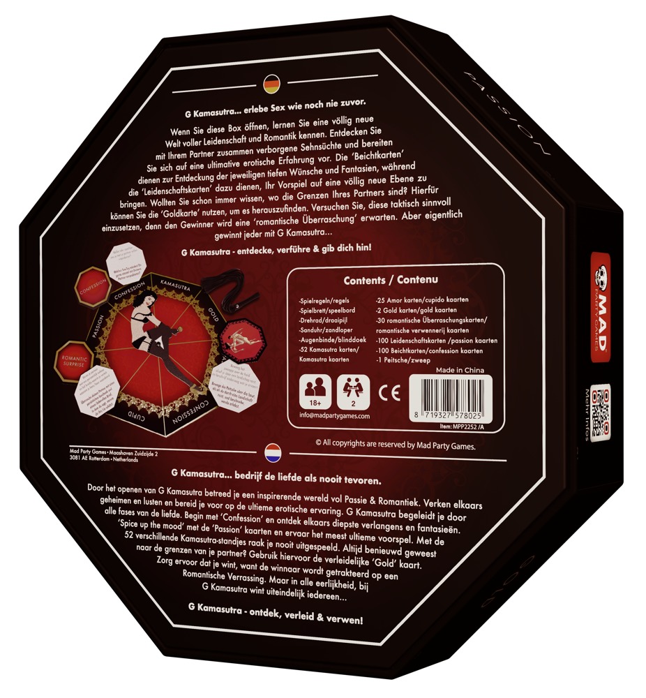 Het erotische bordspel G-Kamasutra van Mad Party Games is een spel voor koppels die samen hun intimiteit willen ontdekken of verdiepen. Het combineert speelse opdrachten met sensuele uitdagingen. Verschillende kaarten zorgen bijvoorbeeld voor romantische verrassingen, onthullingen van geheime verlangens en Kamasutra uitdagingen. Het spel bevat ook een satijnen blinddoek, een zweep en een zandloper, die voor extra spanning zorgen en de gezamenlijke speelervaring intensiveren.