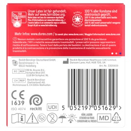 Transparente Kondome Gefühlsecht Classic von Durex aus Naturkautschuklatex mit Feuchtbeschichtung auf Silikonbasis. Im Vergleich zu herkömmlichen zylindrischen Kondomen bietet die innovative anatomische Easy-on-Form der Durex-Kondome an den richtigen Stellen etwas mehr Platz und gewährleistet so ein leichteres Anlegen und Abrollen sowie komfortablen Sitz und intensives Empfinden.