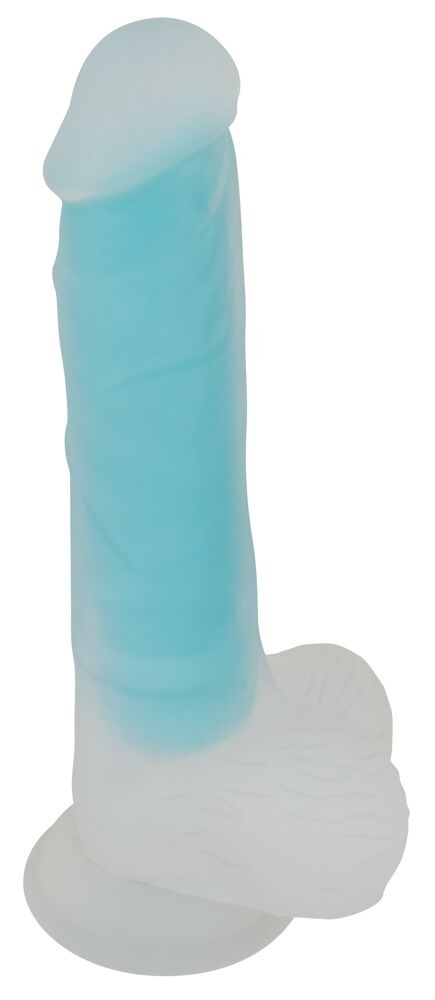 Mjölkvit-genomskinlig dildo med turkost inre som lyser i mörkret. Dildon har pung, ollon och ådring. Flexibel och stabil tack vare att den är mjuk på insidan och hård inuti. Av ett Liquid Silicone som är fritt från porer och skarvar. Den supermjuka ytan glider som av sig själv - även in i intima regioner. Med praktisk sugfot som möjliggör en frihändig njutning.