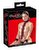 Polsino da collo con barra ad anelli e set di manette con moschettone. Realizzato in sensuale raso rosso e pizzo nero. All'interno in nobile velluto nero. Con chiusure in velcro regolabili individualmente.
