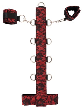 Halsboja med förbindelse med ringar och handbojeset med karbinhakar. Av läckert röd satin och svart spets. På insidan befinner det sig ädel, svart sammet. Med individuellt justerbara kardborrband.