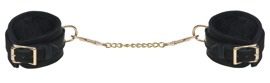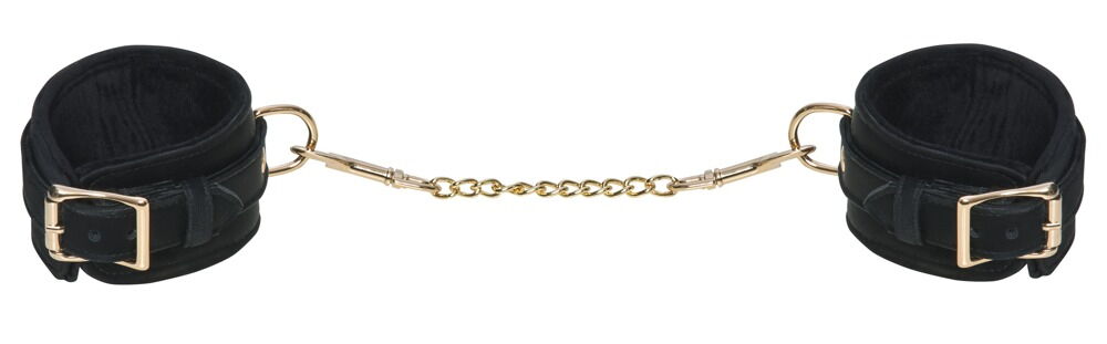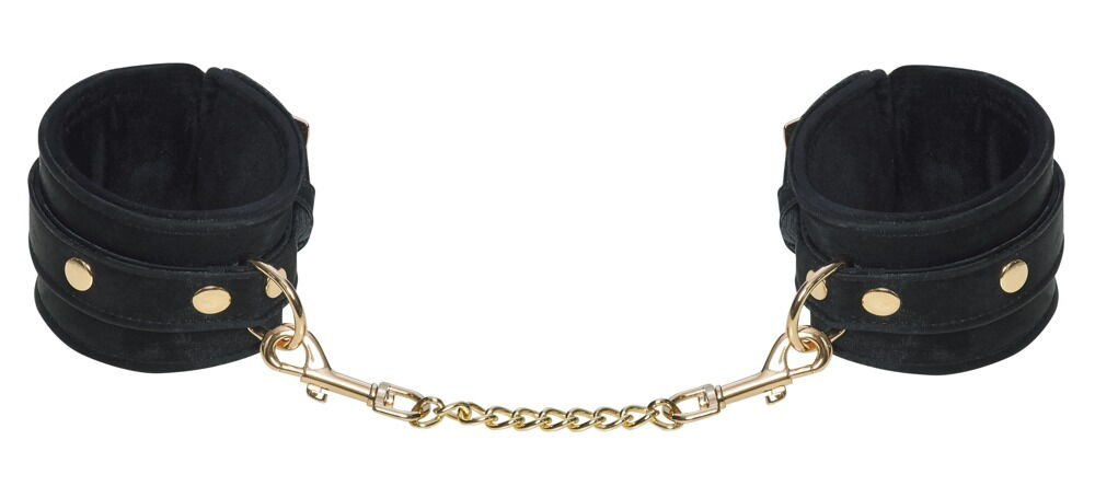 Manette eleganti in nero profondo di Bad Kitty con finitura vellutata e scintillante ed eleganti dettagli dorati. Lavorazione di alta qualità con bordi. Regolabili con fibbie. La catena di collegamento color oro con moschettoni è staccabile.