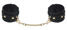 Głęboka czerń, eleganckie kajdanki od Bad Kitty z aksamitnym, połyskującym wykończeniem i eleganckimi detalami w kolorze złota. Wysokiej jakości wykonanie z lamówką. Regulowane za pomocą zapięć klamrowych. Łańcuch łączący w kolorze złotym z karabińczykami jest odpinany.