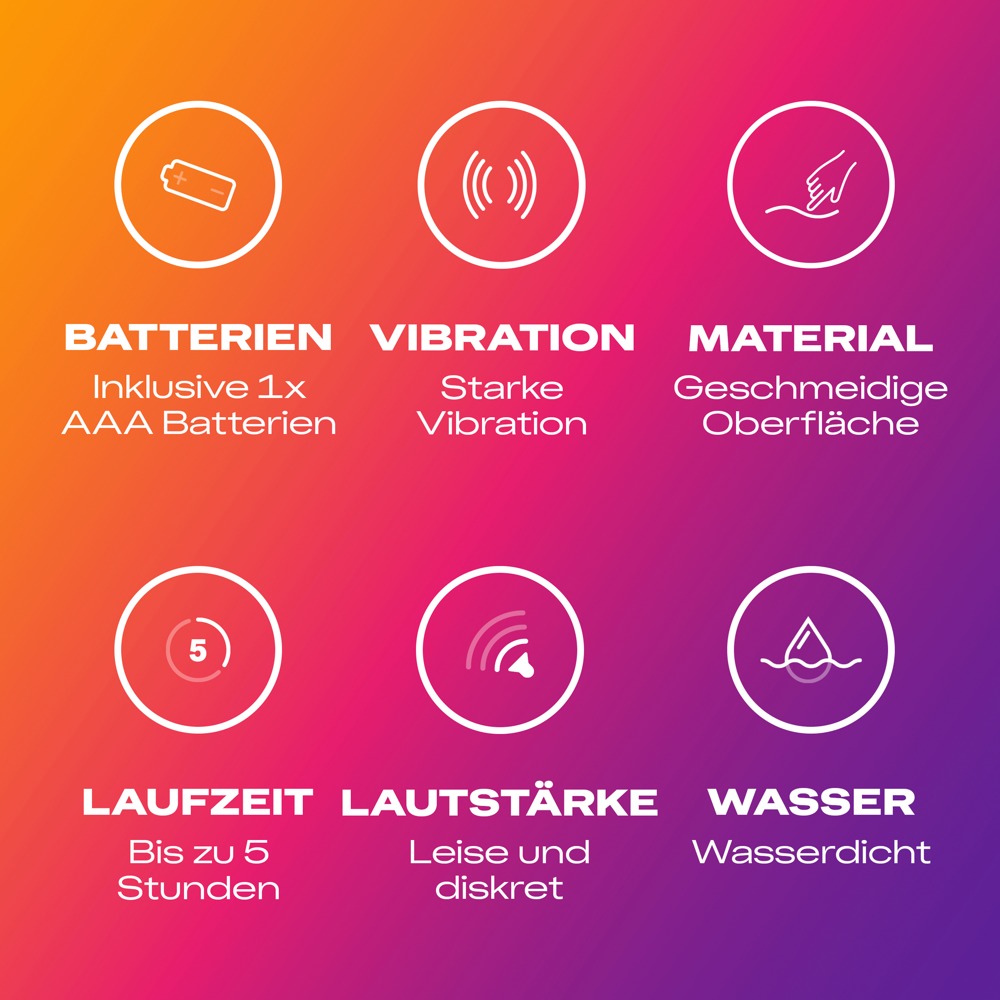 Kraftfull men tystgående minivibrator med mjuk yta. Ca. 9 m lång. ABS med PUR-överdrag. Silikon. Inklusive batterier.