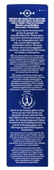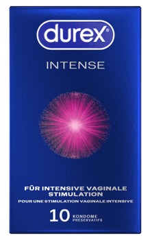 Durex Intense Orgasmic latexkondomer med ribber, nubre og stimulerende Desirex-gel, som giver en varmende, kølende og prikkende effekt. Med mintsmag. Transparent og fugtet på en silikonebase. Sammenlignet med konventionelle cylindriske kondomer giver den innovative anatomiske Easy-on-form på Durex-kondomer lidt mere plads på de rigtige steder, hvilket gør dem lettere at sætte på og rulle af og sikrer en behagelig pasform og intens følelse.