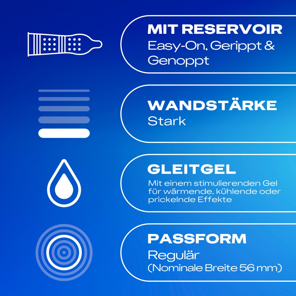 Préservatifs en latex Durex Intense Orgasmic avec nervures, picots et gel stimulant Desirex pour des effets chauffants, rafraîchissants et pétillants. Avec un arôme de menthe. Transparent et humidifié à base de silicone. Par rapport aux préservatifs cylindriques traditionnels, la forme anatomique innovante Easy-on des préservatifs Durex offre un peu plus de place aux bons endroits et garantit ainsi une mise en place et un déroulement plus faciles ainsi qu'une assise confortable et des sensations intenses.