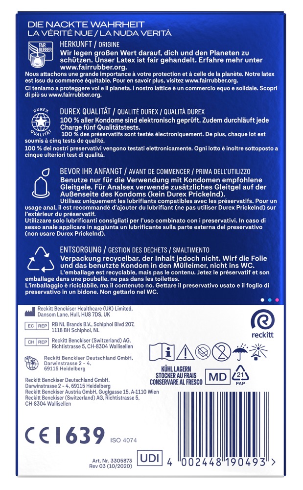 Dotted land grooved latex condoms with stimulating Desirex gel that provides warming, cooling and tingling effects. With mint flavour. Transparent and covered in silicone-based lubricant. Compared to conventional cylindrical condoms, the innovative anatomical Easy-on shape of the Durex condoms offers a little more space in all the right places, making them easier to put on and roll off – ensuring a comfortable fit and an intense sensation.