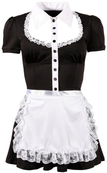 Sort minikjole med hvid krave, knaplidse og flæsepynt ved dekolletéet. Inkl. hvidt forklæde, som bindes bagpå.