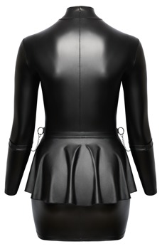 Stram, fremhævende langærmet minikjole fra Cottelli BONDAGE inklusive to armmanchetter. I et elegant skinnende sort mat look - blød og elastisk over det hele for en høj grad af komfort. Med diskrete lynlåse over brysterne til åbning. Der er også en fin lynlås bagpå for nem af- og påklædning. En ring under ståkraven til de justerbare bryst- og taljestropper. Taljerem med peplum og ankelringe i siden til de lukkede armmanchetter med deres karabinhager. Ankelmanchetterne kan hurtigt tages af og på ved hjælp af de justerbare velcrolukninger. Bryst- og taljeremmene (med peplum) kan også tages helt af.