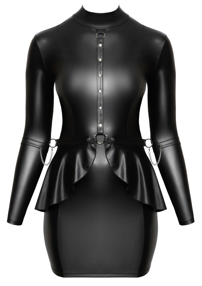 Smalt skåret, langermet kjole fra Cottelli CURVES inklusive to armlenker. i edel svart mattlook et mykt, elastisk stoff som gir maksimal komfort. Diskret glidelås over brystene som kan åpnes etter ønske. Glidelås bak forenkler av- og påkledning. Ring under ståkragen til det justerbare bryst- og livbeltet. Peplum og ringer i livet hvor de vedlagte lenkemansjettene kan festes. Mansjettene lukkes og justeres med borrelås. Bryst- og livbeltet kan også tas av.