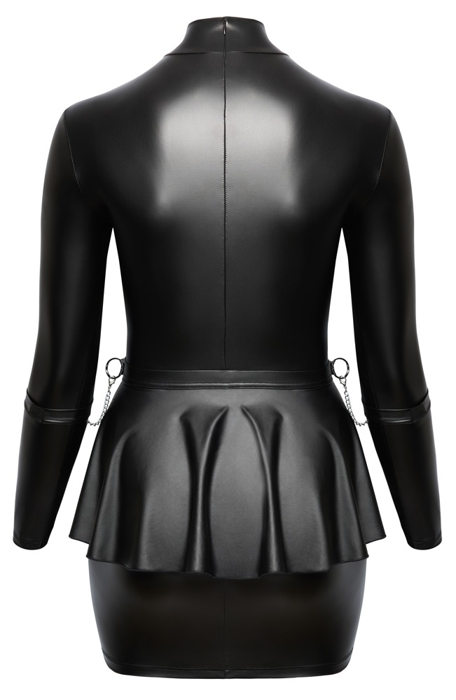 Minivestido ajustado y acentuado de manga larga de Cottelli BONDAGE con dos manguitos para los brazos. Con un elegante efecto mate negro brillante, suave y elástico en todo el cuerpo para una mayor comodidad. Con discretas cremalleras sobre los pechos para abrirlo. También dispone de una fina cremallera en la espalda para vestirse y desvestirse con facilidad. Una anilla bajo el cuello alto para los tirantes ajustables del pecho y la cintura. Correa en la cintura con peplum y anillas laterales en los tobillos para los puños cerrados con sus cadenas de mosquetón. Las esposas de los tobillos pueden ponerse y quitarse rápidamente gracias a los cierres de velcro ajustables. Las correas de pecho y cintura (con peplum) también pueden quitarse completamente.