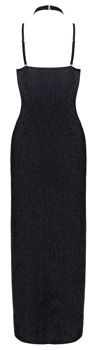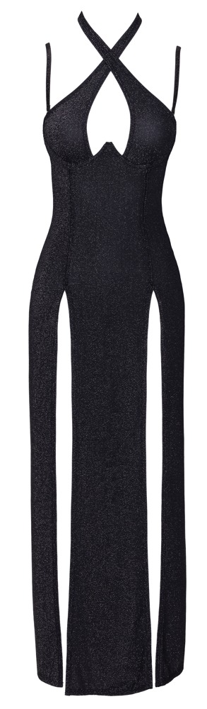 The long elegant dress from Cottelli PARTY is made out of shimmering black material. It is tight-fitting and has integrated underwired cups for a beautiful cleavage. With a halterneck (hook fastener) that can also be worn in a criss-cross way at the front. It is backless and strapless – the additional matching shiny bra straps can be removed. The long, tight-fitting skirt part has two high slits up the front for optimum freedom of movement and lots of sex appeal. The stretchy glittery material clings sexily to the body for a very comfortable fit.