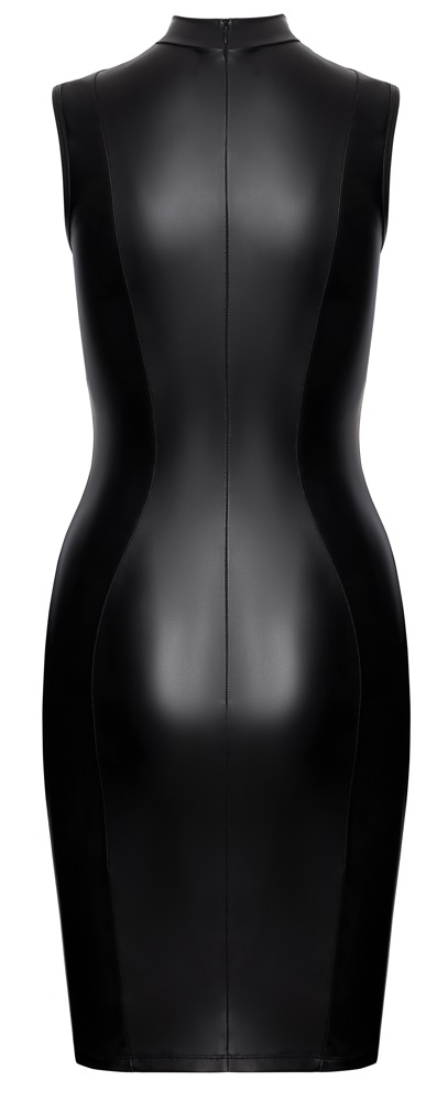 Ærmeløs kjole fra Cottelli PARTY i et sofistikeret sort, mat look. Tætsiddende stil med opretstående krave og knælængde. De to elastiske åbninger til de enkelte bryster er et ægte blikfang. Justerbare bryststropper med integrerede, sølvfarvede brystvortebeskyttere sætter en spændende prik over i'et på det sexede look. Med en lang lynlås bagpå for nem af- og påklædning. Blød og elastisk hele vejen rundt for en høj grad af komfort.