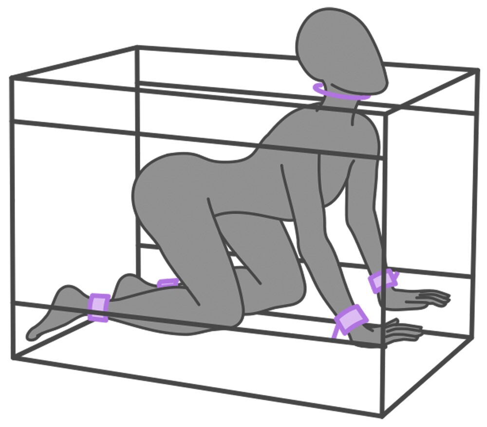 The closed BDSM box, La Niche from Secret Dome, is perfect for glory hole fun, dark games, captivating role play and other fantasies. The sturdy box with its tube plug-in system and robust cover can be quickly assembled and will be ready to use in no time at all. With 3 large holes at the sides. The hole for the head has a zip and a wide, adjustable collar. It also provides convenient access via the zip door. The LED light and a soft floor mat ensure great comfort. The included handcuffs and ankle cuffs (1 set of each) can be positioned inside as required. The soft padded restraints can be put on and adjusted quickly with the buckle fasteners.