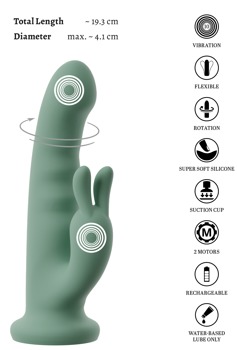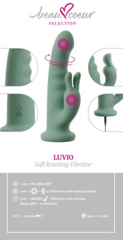 The easy-to-use, sensually designed LUVIO Soft Rotating Vibrator from beau cœur has a suction cup. With its 2 motors, the quiet rabbit vibrator provides simultaneous stimulation both inside and out. The shaft has gentle grooves and its vibro-head rotates in the vagina for a deep stimulating massage. In addition to that, the flexible vibro-bunny intensely stimulates the clitoris and vulva.