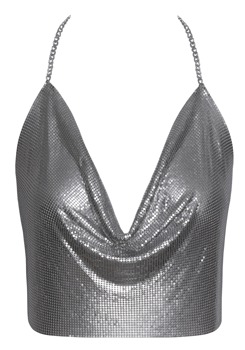 Crop top marki Cottelli ACCESSOIRES wykonany z małych srebrnych opalizujących metalowych płytek z dekoltem typu waterfall. Miękki i przytulny w noszeniu. Łańcuszek na szyi i łańcuszek na plecach można indywidualnie regulować i dostosowywać za pomocą zapięć homara.