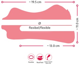 Longitud total 19,5 cm, profundidad de inserción boca/vagina 19,5 cm, ano 13 cm (elástico);