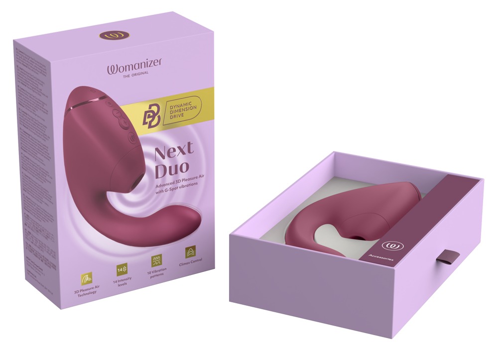Womanizer Next Duo kombinerer den revolutionerende 3D Pleasure Air-teknologi til klitoris med kraftfuld G-punktsstimulering – nu endnu mere intens takket være det nye Dynamic Dimension Drive! Denne næsten lydløse (37 dB) dobbelte stimulator tilbyder et helt nyt niveau af blandede orgasmer: G-punktsvibrationer og pulserende klitorisstimulering smelter sammen til en unik, dyb oplevelse, der gør orgasmerne omfangsrige og langvarige. For intense, personlige øjeblikke af nydelse, der går dybt ind under huden og bliver hængende i lang tid.