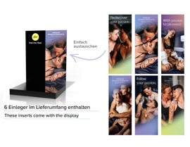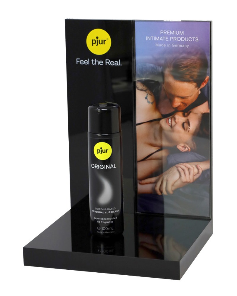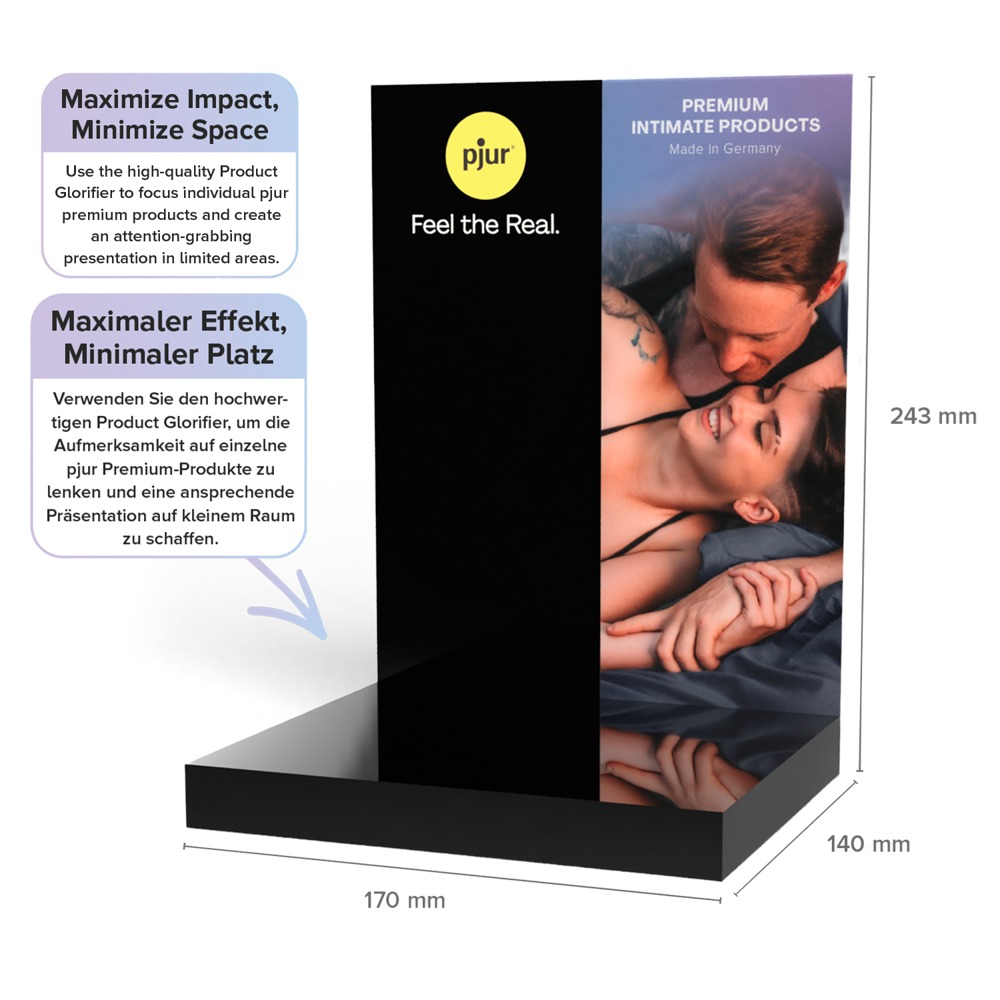 Advertise one to two top products from pjur in a great way with this high-quality Product Glorifier. Customers will want to take a look at the products being advertised. Includes 6 different inlays. Easy to assemble.