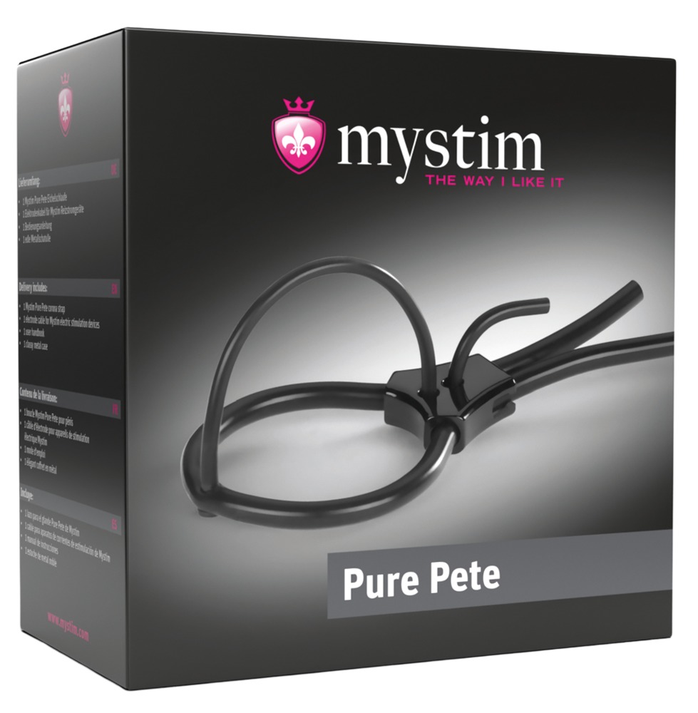 Pure Pete er ei løkke til penishodet fra eStim. Den legger seg rundt glans og sender kriblende impulser til den svarte silikonbøylen som stimulerer. Penishodeløkka med 2 mm plugg er trinnløst justerbar til maks 7,5 cm og trenger et pirrestrømsapparat som artnr. 0528927 0000 eller 0529761 0000 for å aktivere polene. Materiale: paltinsilikon, ABS. Inklusive elektrodekabler og metall-eske.
