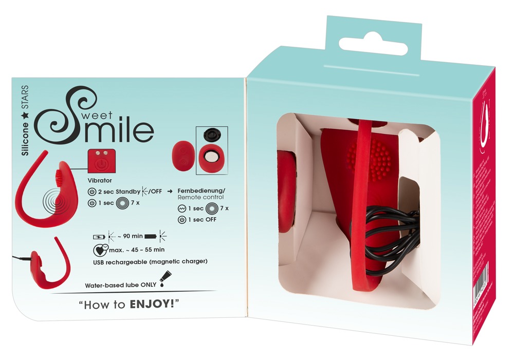 Anatomisk formet, flad RC trussevibrator fra Sweet Smile, som forkæler vulva, klitoris og anus/dam på samme tid. Kan bæres upåfaldende i trusser - også under vand, da den er vandtæt.