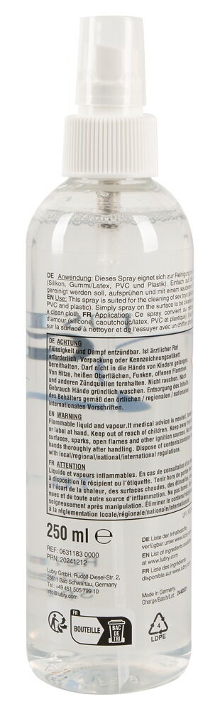 The cleaning spray Toys from Just Glide is perfect for silicone, rubber/latex, PVC and plastic toys. Just spray it on and clean it off again with a clean cloth. Very thick – a few sprays is enough for a great clean. 250 ml.