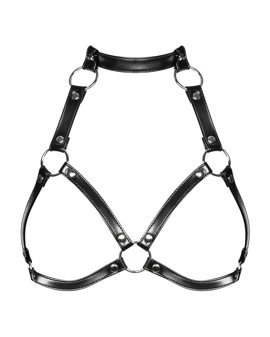 Soutien-gorge ouvert noir A740 de Obsessive en lanières de similicuir douces avec des anneaux décoratifs. La bretelle inférieure est réglable dans le dos avec une fermeture à boucle, tout comme le tour de cou.