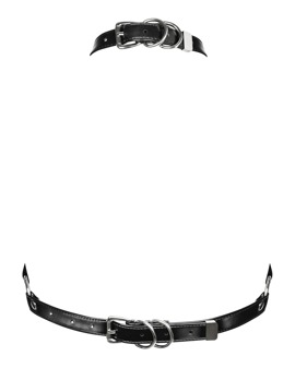 Reggiseno overt nero A740 di Obsessive, realizzato con cinghie in morbida ecopelle con anelli decorativi. La fascia sottoseno è regolabile sulla schiena con una fibbia, così come il collo alto.