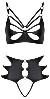 Conjunto de sujetador y braguita sin entrepierna de Cottelli LINGERIE en suave material elástico negro. Estilo llamativo con correas elásticas y anillas de color oro rosa. Sujetador suave con cierre de gancho en la espalda y tirantes ajustables a juego. El slip de corte a la altura de la cintura seduce con 2 bandas elásticas en la entrepierna completamente abierta.