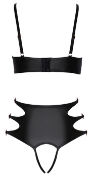 Ensemble soutien-gorge et slip ouvert de Cottelli LINGERIE en matière stretch douce noire. Style pointu avec des lanières élastiques et des anneaux dorés roses. Soutien-gorge doux avec fermeture à crochet dans le dos et bretelles réglables assorties. Le slip coupé à la taille séduit par ses 2 bandes élastiques à l'entrejambe entièrement ouvert.