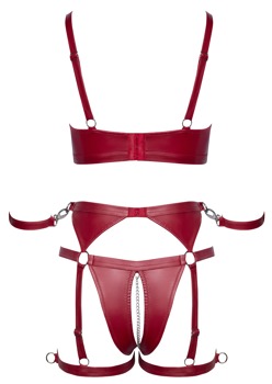 Sexy sett fra Cottelli BONDAGE med soft-BH, åpen truse med strømpestropper og to softe lenker. Alt i edel rød mattlook med sølvfargede detaljer som ringer. BH med ring mellom skålene, justerbare skulderstropper og hektelukking bak. Truse med livhøy linning og strømpestropper. Justerbar hektelukking bak og avtagbar pirrelenke i det åpne skrittet, helt til over baken. Stroppene er justerbare for perfekt passform. Lenkene kan hektes i ringene med karabinkrok. De myke lenkene lukkes og justeres med borrelås.