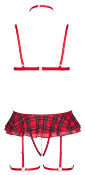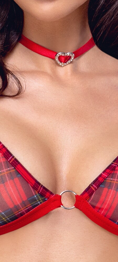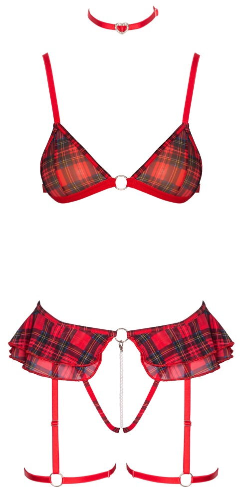 Frækt lingerisæt fra Cottelli COSTUMES med blød bh, skridtfri g-streng med strømpeholdere og choker. I et rødt ternet look med sofistikerede detaljer. Bh'en har en ring mellem de bløde skåle, og stropperne kan justeres, så de passer. Skridtfri g-streng også med en ring foran og 2-lags flæse i linningen. Den stimulerende perlekæde i det helt åbne skridt er aftagelig. Ligesom de justerbare strømpeholdere med justerbare lårstropper. Den smalle røde krave med et rhinstenhjerte og klipslukning kan også justeres, så den passer.