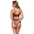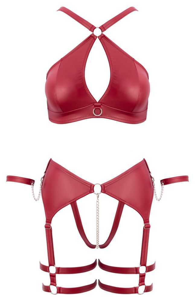 Ekscytujący zestaw bielizny od Cottelli BONDAGE z miękkim biustonoszem, szelkami bez krocza i miękkimi kajdankami. Całość w stylowym ciemnoczerwonym matowym kolorze ze srebrnymi dodatkami. Elastyczny i miękki na całej powierzchni dla wysokiego komfortu noszenia. Sprytnie zaprojektowany biustonosz z pierścieniem między miękkimi miseczkami. Ramiączka i zapięcie na haftki z tyłu można regulować. Stringi bez krocza mają uwodzicielski wygląd paska do pończoch z podwójnymi paskami na udach. Ramiączka i paski do pończoch również można dopasować. Całkowicie otwarte krocze z odpinanym, stymulującym łańcuszkiem. Ozdobne pierścienie na kostki z przodu, po bokach i z tyłu do mocowania łańcuchów karabińczykowych do kajdanek. Miękkie paski na kostki można szybko założyć i dopasować za pomocą zapięć na rzepy.