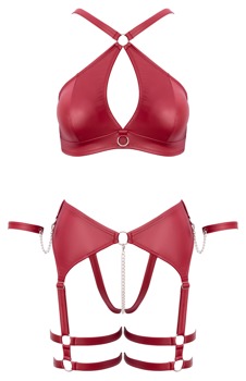 Spændende lingerisæt fra Cottelli BONDAGE med blød bh, skridtløse g-streng med stropper og bløde håndjern. Alt sammen i et stilfuldt mørkerødt, mat look med sølvfarvet tilbehør. Elastisk og blød over det hele for høj bærekomfort. Smart designet bh med en ring mellem de bløde skåle. Stropperne og hægtelukningen bagpå kan justeres, så de passer. Den skridtløse g-streng har et forførende strømpeholder-look med dobbelte lårstropper. Stropperne og strømpeholdere kan også justeres, så de passer. Helt åbent skridt med aftagelig, stimulerende kæde. Dekorative ankelringe foran, i siderne og bagpå til fastgørelse af karabinkæderne til håndjernene. De bløde manchetter kan hurtigt tages på og justeres, så de passer med deres velcrolukninger.